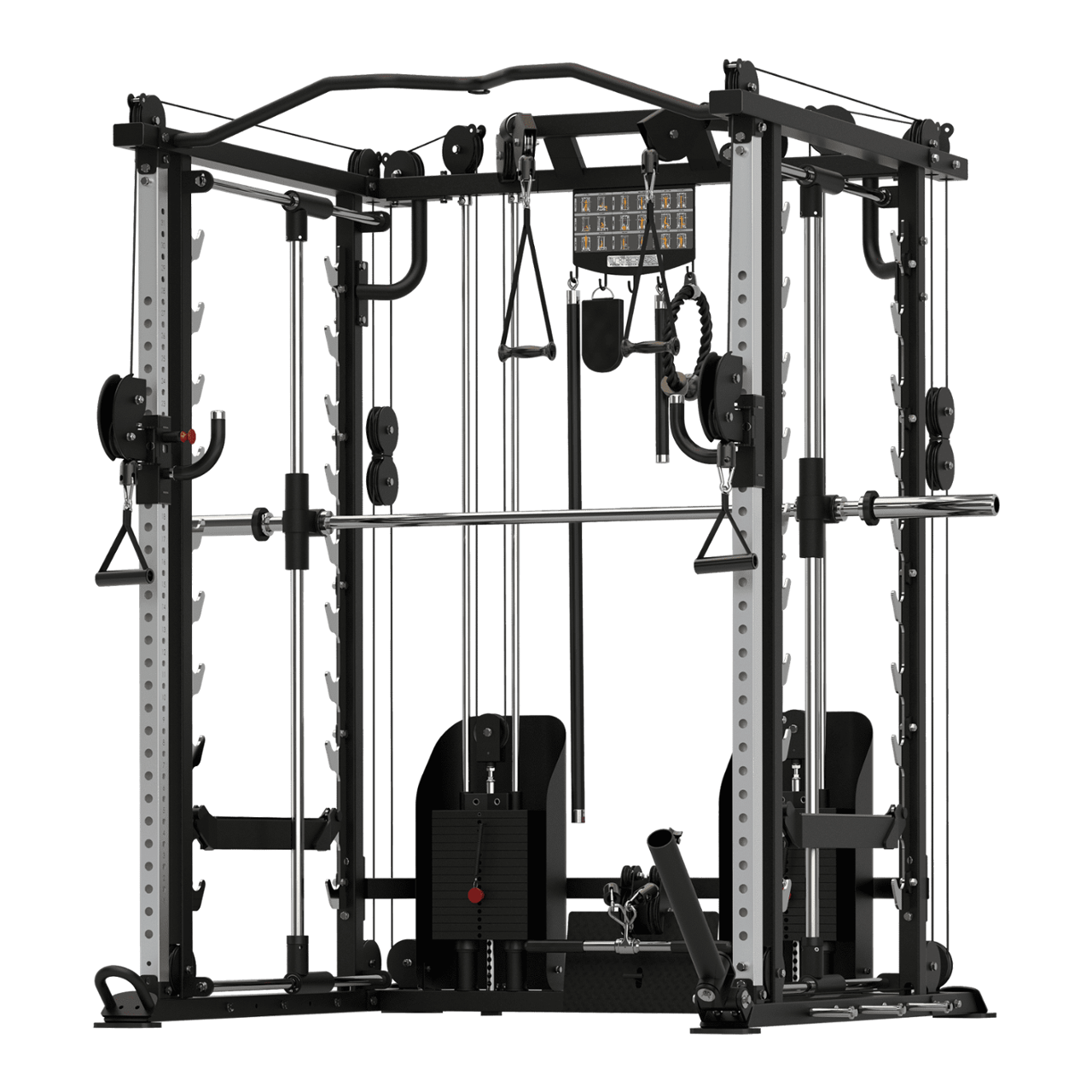 ASX 9000: the All-in-One station ASX 9000, at the top of the Toorx Professional Line range, not only combines a functional rack and a dual pulley with weight stack (2 x 80 kg), but, unique on the market, it is equipped with a guided barbell which, unlike traditional Smith machines that only allow vertical movement, moves both vertically and horizontally, thus allowing any exercise to be performed naturally and freely. The so-called "3D Smith"technology guarantees the ASX 9000 unparalleled versatility and training effectiveness!